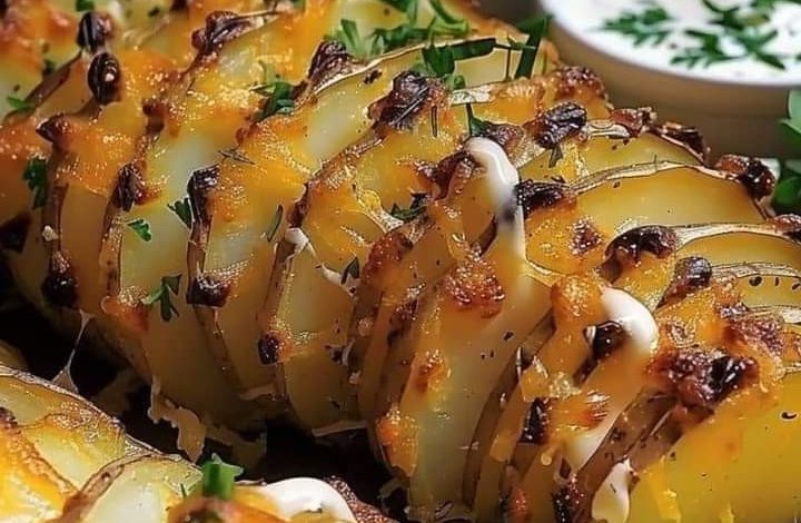 Hasselback potatoes are a delightful and visually appealing dish that brings together the crispiness of roasted potatoes and the gooey goodness of melted cheese. This dish, as shown in the image, features perfectly sliced potatoes baked to a golden brown and generously topped with cheese and herbs, making it an irresistible treat for any occasion. Here’s how you can create this delicious dish at home.