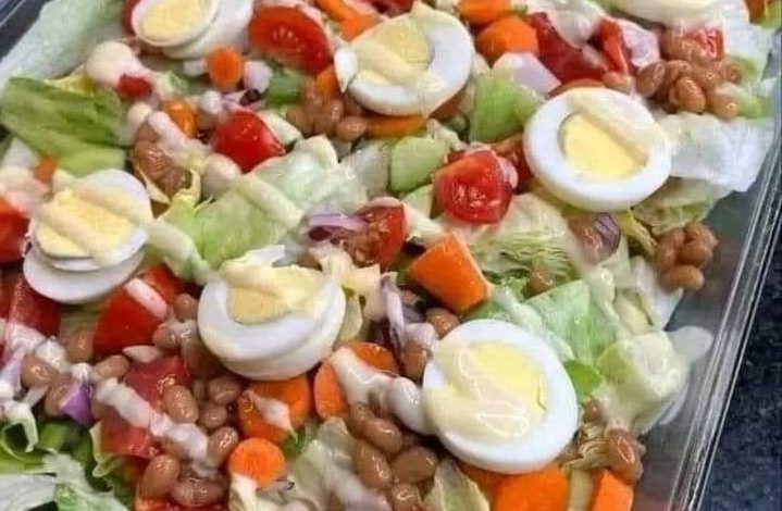 In a large, clear bowl or small plate, layer iceberg lettuce (about 2 cups), tomatoes, peas, and onions. Place the sliced eggs on the side.