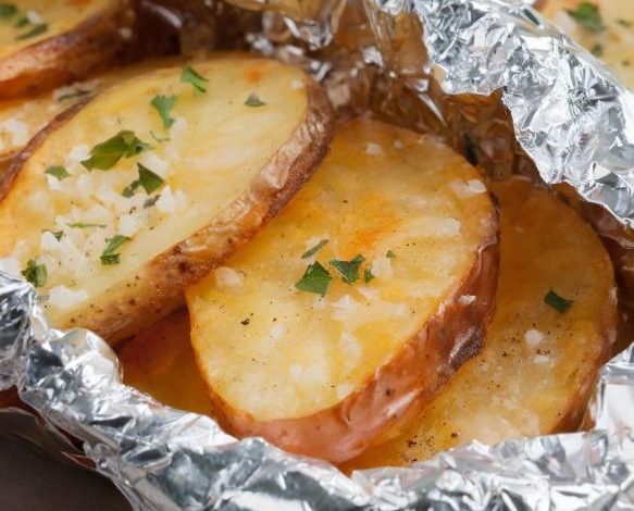 Once the potatoes are cooked, carefully open the foil packets (watch out for oil) and pour the contents over the food.