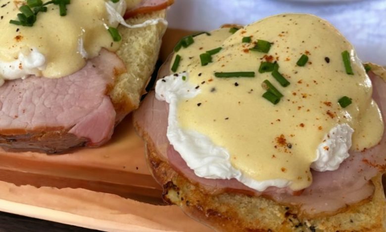 Elevated English Muffins. Top each side with a slice or two of Canadian bacon followed by a poached egg. Finish with Hollandaise sauce.