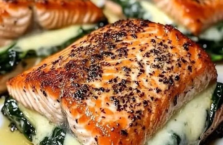 - Place a generous amount of creamy spinach on each plate. Top with a salmon fillet. Garnish with grated Parmesan cheese if desired.