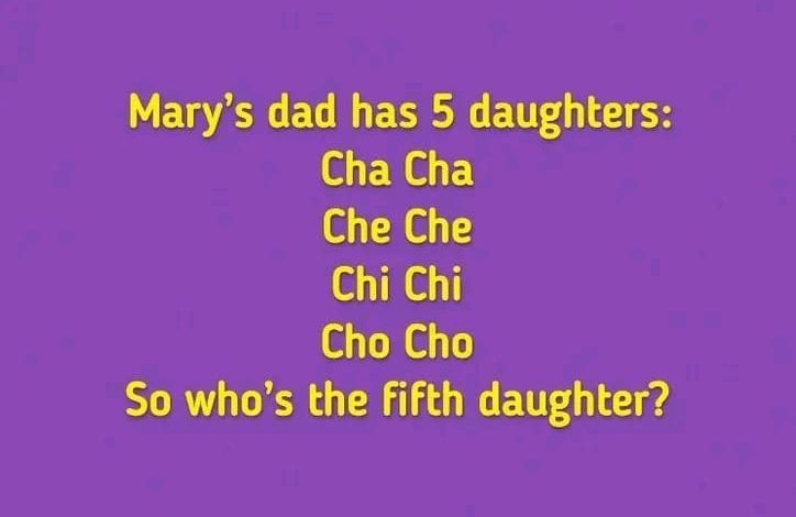 The riddle presented states: “Mary’s dad has 5 daughters: Cha Cha, Che Che, Chi Chi, Cho Cho. So who’s the fifth daughter?” This riddle cleverly uses naming patterns and reader assumptions to mislead the solver. Initially, it sets a pattern with the names Cha Cha, Che Che, Chi Chi, and Cho Cho, leading one to expect a similar sounding name for the fifth daughter. However, the answer is subtly given in the very first line of the riddle—Mary.