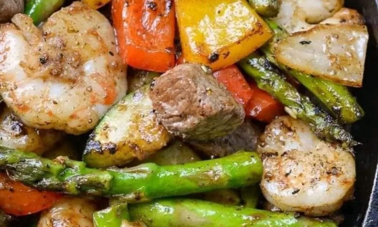 Heat a large frying pan or griddle to heat. Use cooking oil. Add the meat and vegetables to the pan, trying to place everything in the same layer if possible.