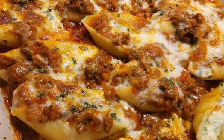 Pour the meat mixture into the prepared pasta shells.Pour 1/4 of the sauce container over the base of a 9-by-13-inch warming dish. Spread the stuffed mussels over the sauce. Pour remaining sauce over the bowls.
