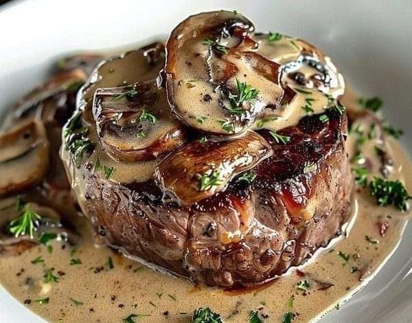 Enjoy your elegant and flavorful filet mignon with creamy mushroom sauce!