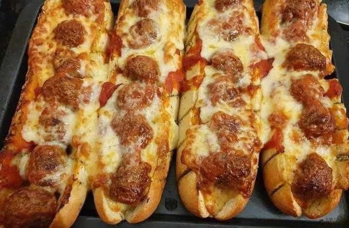 Once the garlic bread is ready, remove it from the oven and generously brush each half of the bread with Bolognese sauce.Place the meatballs on the sauce and sprinkle with grated mozzarella and grated Parmesan.