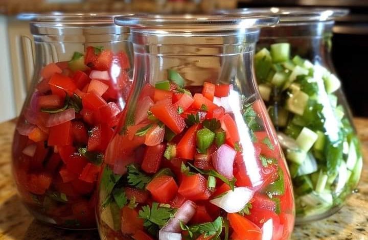 - In a large mixing bowl, combine the quartered cherry tomatoes, diced cucumber, red bell pepper, green bell pepper, and red onion.