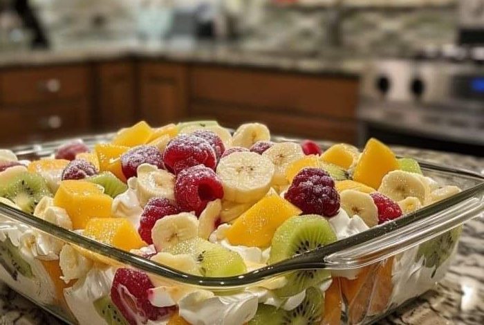 - Add a layer of mixed fruits (raspberries, banana slices, kiwi slices, and mango chunks).