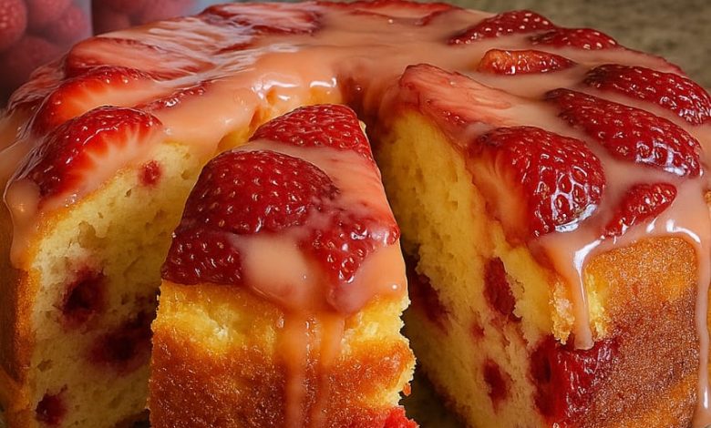 Pour the batter into the prepared Bundt pan. Press the remaining strawberry halves gently into the top for a beautiful finish. Bake for 50–60 minutes or until a toothpick inserted comes out clean.