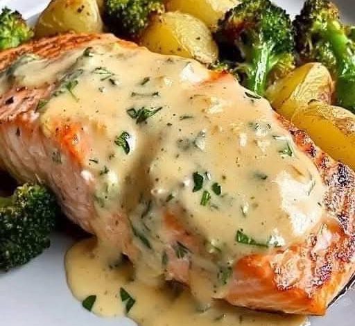 Assemble the Dish: Once the salmon, roasted vegetables, and sauce are ready, plate the salmon fillets alongside the roasted broccoli and potatoes. Spoon a generous amount of the creamy garlic sauce over the salmon fillets, allowing the sauce to cascade down the sides of the fish.