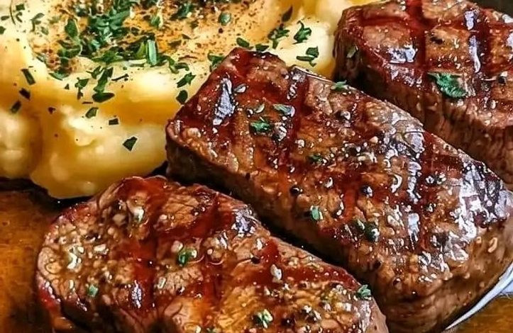 - Serve the steaks alongside the creamy mashed potatoes. Drizzle sauce over the steak and sprinkle parsley or chives for garnish.