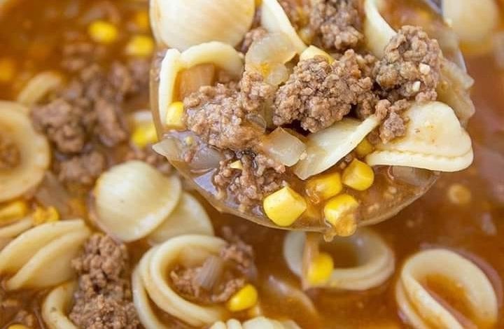 Hamburger soup is easy, cheap and ready in 30 minutes. It consists of ground beef, noodles, and vegetables in a rich, flavorful broth.