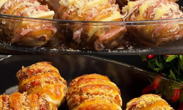 Hasselback potatoes are a delightful and visually appealing dish that combines the crispiness of roasted potatoes with the rich flavors of cheese and prosciutto. These potatoes, as shown in the image, are sliced thinly, filled with cheese and prosciutto, and baked to perfection. Here’s how you can make these delicious Hasselback potatoes at home.