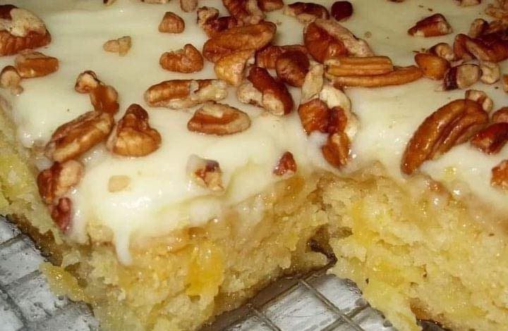Gradually add the powdered sugar.Spread the cream cheese frosting on the still warm cake.