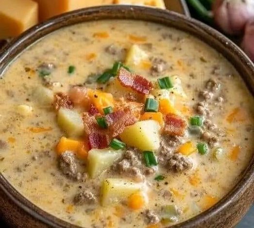 - Return the cooked beef to the pot. Stir in the heavy cream and grated cheese, cooking until the cheese is melted and the soup is heated through.