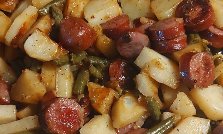 Wash, peel, and dice the potatoes into bite-sized cubes. Slice the sausage into even rounds for consistent cooking. Chop the onion and trim the green beans if using fresh.