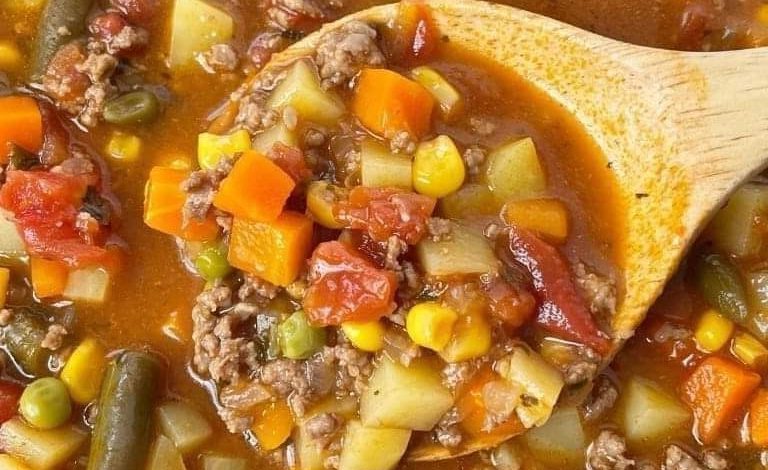- Add the beef broth, water, diced potatoes, carrots, green beans, corn, peas, and diced tomatoes (with their juice) to the pot.