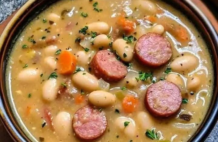 - In a separate skillet, cook the sliced sausage until browned. Once cooked, add the sausage to the soup.