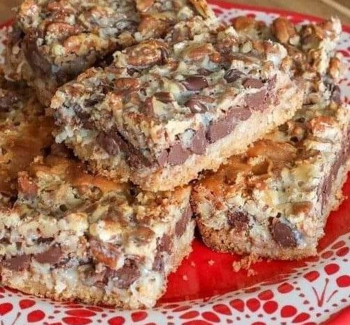 Place chocolate chips, butterscotch, coconut and pecans on the cake.