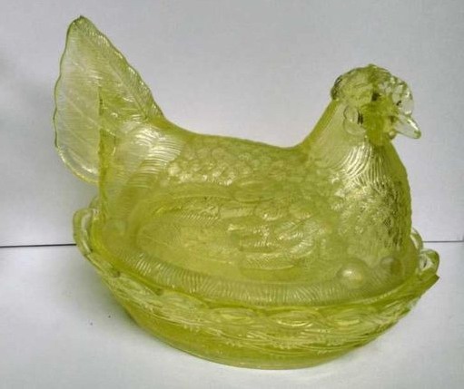 This is a vintage glass dish in the shape of a hen, which sits on a nest-like base. The dish is often made of colored or clear pressed glass and comes in two parts: the hen as the lid and the nest as the base.