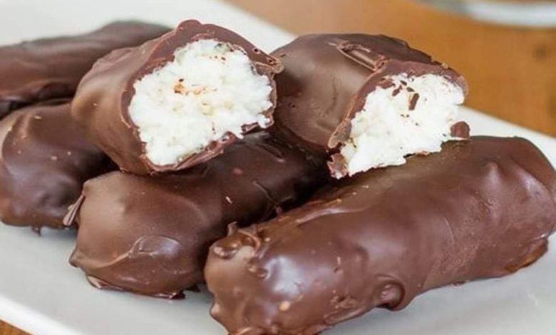 - Using a fork or dipping tool, dip each chilled coconut bar into the melted chocolate, making sure to coat it completely. Allow any excess chocolate to drip off, then place the coated bars back on the parchment-lined baking sheet.
