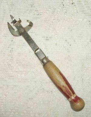 This type of can opener typically features a wooden or metal handle for grip, a sharp blade or hook for puncturing the can, and a small, serrated edge that helps to cut through the metal lid. The user would insert the pointed edge of the opener into the top of the can and then leverage the tool to cut along the edge of the lid.