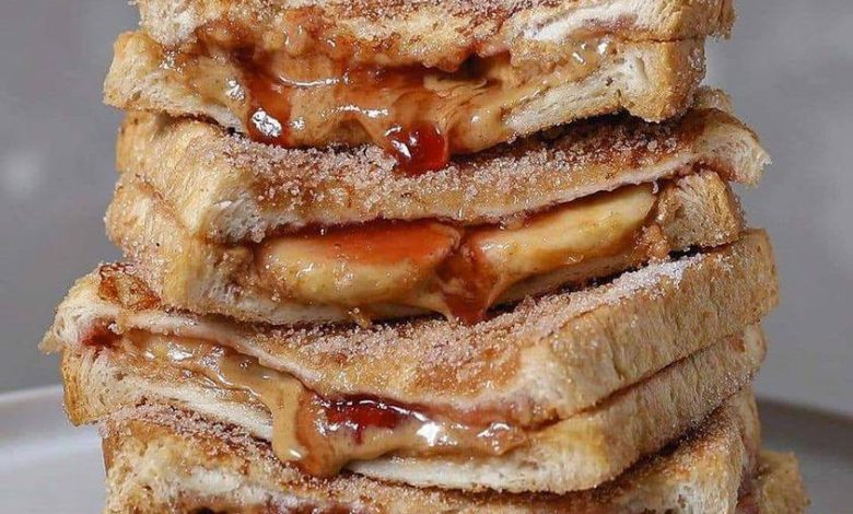 In Mix egg, sugar, milk, vanilla and cinnamon in a bowl. Prepare peanut butter and jelly with a banana in the middle. Place the butter in a frying pan and heat over medium/low heat.Carefully and quickly dip the sandwich into the egg mixture. Then add it to the pan. Fry or lightly brown for 3 minutes on each side.