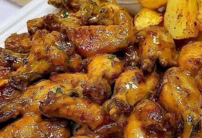 Enjoy your honey garlic glazed chicken wings with fries and creamy dipping sauce! This meal is perfect for a hearty appetizer or a main dish.