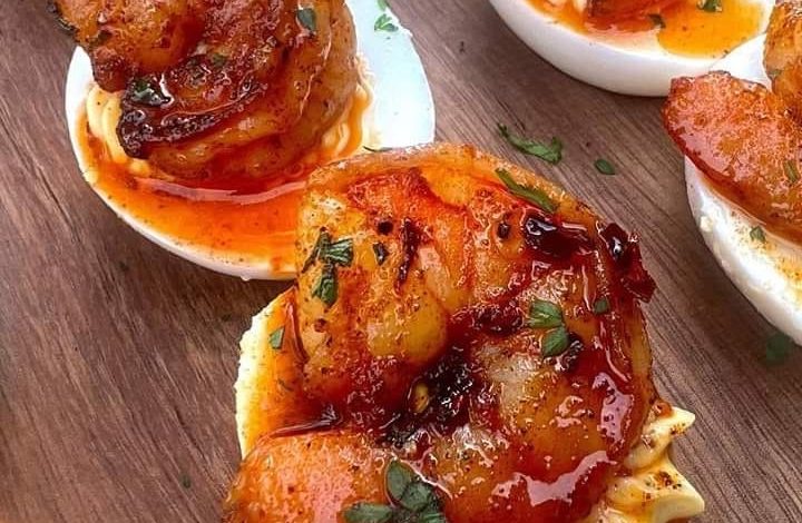 Enjoy your Hot Honey Shrimp Deviled Eggs! This creative and flavorful appetizer is sure to be a hit at any gathering, combining the creamy, tangy flavor of traditional deviled eggs with the sweet and spicy kick of hot honey shrimp.