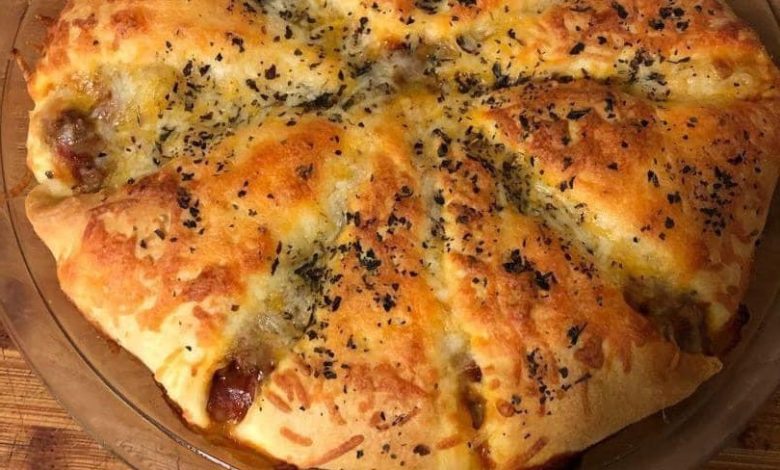 In a skillet, combine meat and sauce to form pasta. Bring to a boil over medium-high heat, stirring occasionally.Divide the dough into 8 triangles. Place the dough in a spoke shape on an ungreased 9-inch glass pie plate, with the narrow points overlapping the edge of the dish by about 3 inches.