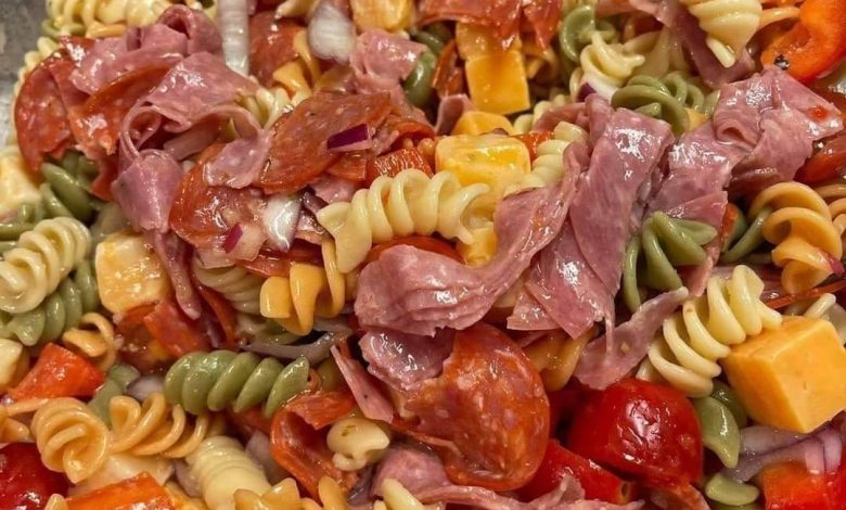 - In a large mixing bowl, combine the cooked and cooled pasta, cherry tomatoes, cheddar cheese, red onion, bell peppers, pepperoni, salami, and any other optional ingredients you’re using.