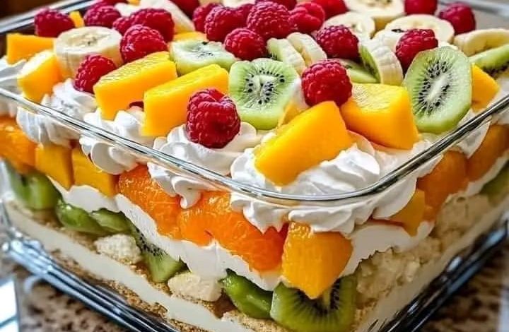 - Finish with a final layer of whipped cream. Decorate the top with an artistic arrangement of raspberries, orange sections, and any additional fruits.