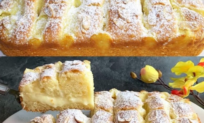 Lemon almond cream cake is a delightful dessert that combines the light, fluffy texture of cake with the tangy sweetness of lemon and the rich, creamy filling. This cake, as shown in the image, is beautifully dusted with powdered sugar and topped with sliced almonds, making it a perfect treat for any occasion. Here’s how you can make this exquisite lemon almond cream cake at home.