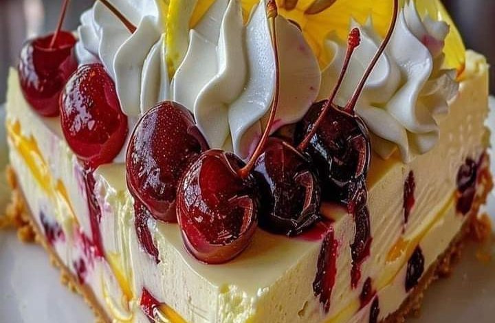 • Before serving, garnish the dessert with whipped cream, fresh cherries, and lemon slices.