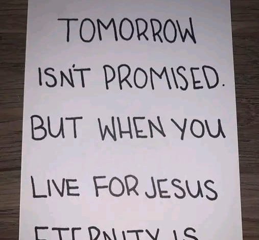 The message that “Tomorrow isn’t promised, but when you live for Jesus, eternity is” serves as a powerful reminder of the choices we make every day. It challenges us to look beyond the temporary and to invest in what will last forever. By living for Jesus, we find a purpose that endures beyond the limits of time and a hope that carries us through every trial and uncertainty.