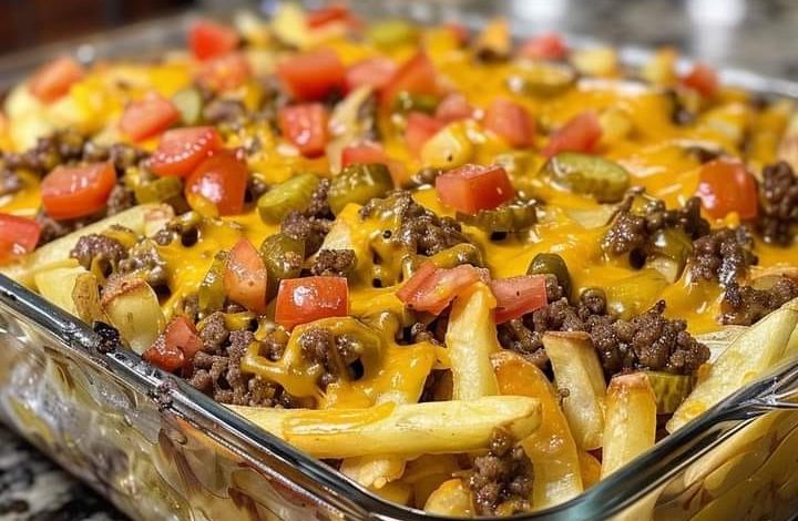 • Repeat the layers with the remaining fries, beef mixture, and cheddar cheese.