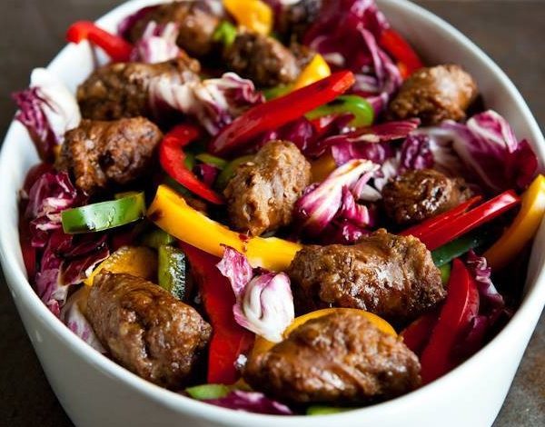 Mix the sliced peppers, onions and radicchio in a salad bowl. Top with boiled sausage. Drizzle with balsamic vinegar and olive oil to taste