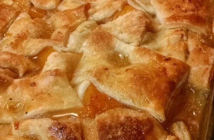 - Carefully place the dough over the peach filling in your desired pattern. If using strips, weave them into a lattice. If covering the cobbler with a whole sheet of dough, cut a few slits in the top to allow steam to escape.