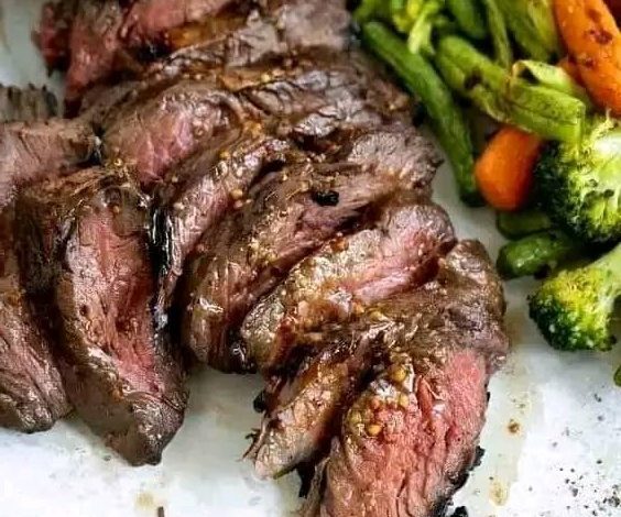 Enjoy your marinated steak with roasted vegetables! This meal is perfect for a hearty and flavorful dinner.