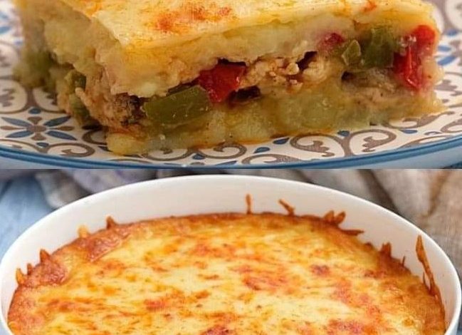 - In a large baking dish, layer the fried potatoes, followed by a layer of eggplant and zucchini.