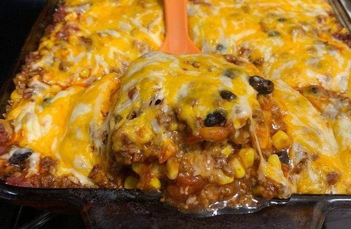 In a pan, add the minced meat and fry over medium heat until evenly browned. Flow away.In a 9×13 inch baking dish, combine beef, corn, salsa, olives, cooked pasta, beans, taco sauce, seasoning mix, and tomato sauce.
