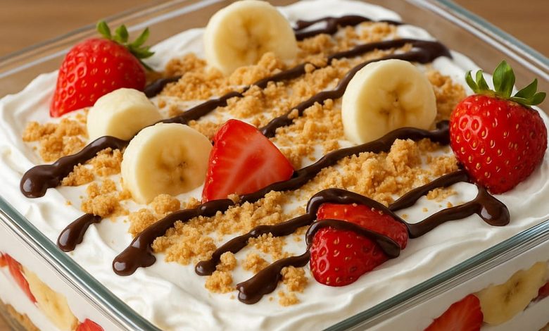 This No-Bake Banana Split Cake is a crowd-pleasing, refreshing dessert that brings all the flavors of the classic banana split — without the need for an oven. With layers of creamy cheesecake filling, fresh bananas and strawberries, crunchy graham cracker crust, and a final drizzle of chocolate, it’s as beautiful as it is delicious. Whether you’re entertaining guests or just looking to whip up something sweet and simple, this no-bake cake is the perfect make-ahead treat.