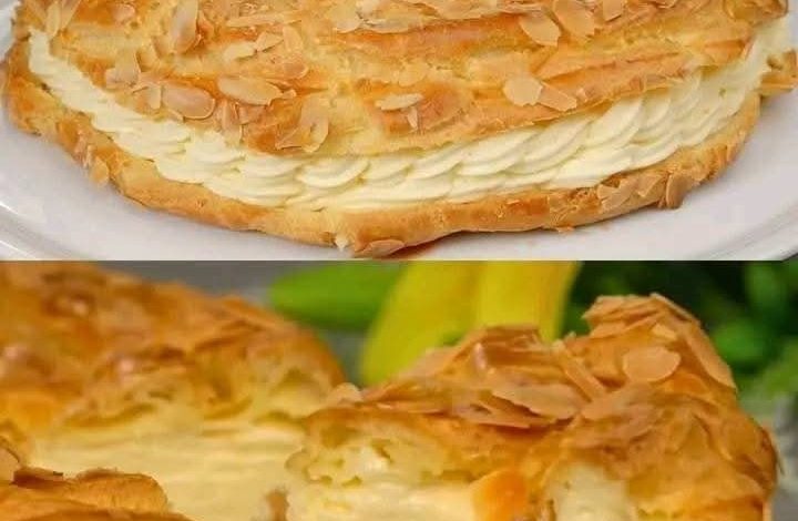 - Pipe the dough into a large ring shape (or multiple smaller ones) on the prepared sheet. Sprinkle with sliced almonds.