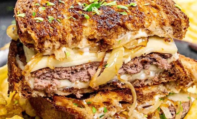 Enjoy your delicious homemade patty melt with its juicy beef patties, melty cheese, and sweet caramelized onions!