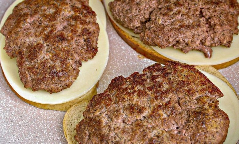 Place a beef patty, two pieces of cheddar cheese, two slices of provolone cheese and two slices of bread on each slice.