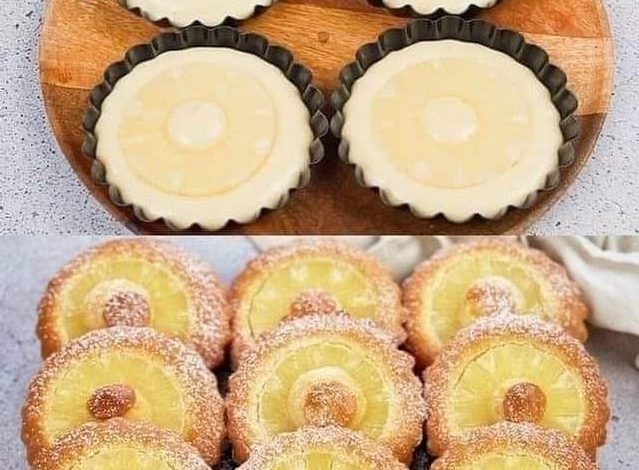 • Place a pineapple ring in each tart pan, and put a maraschino cherry in the center of each pineapple ring.