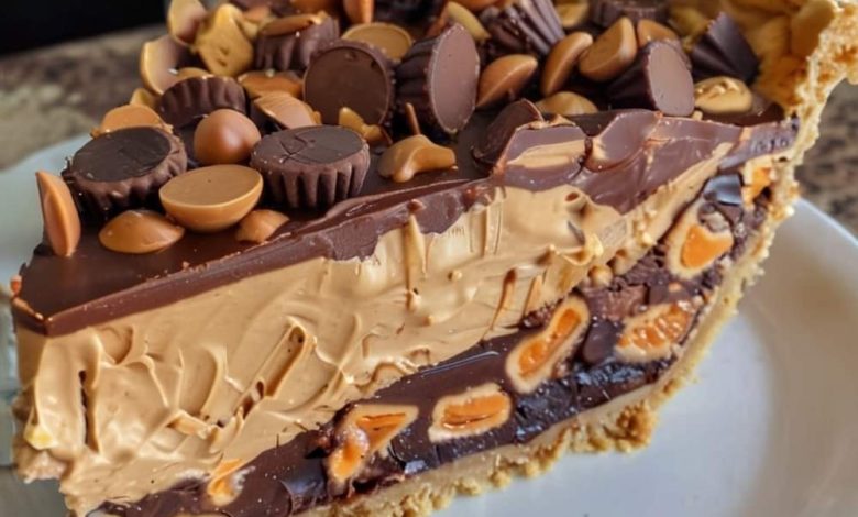 • Garnish the top of the pie with mini peanut butter cups and peanut butter chips.