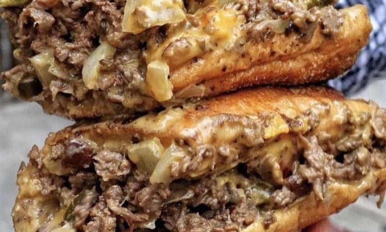 • Slice the hoagie rolls and lightly toast them. Fill each roll generously with the steak and melted cheese mixture.