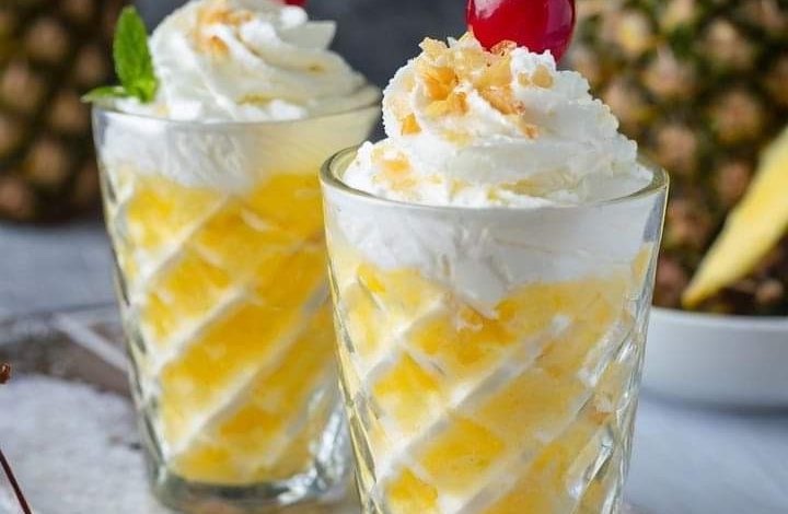 • In serving glasses, layer the pineapple mixture and whipped cream alternately, starting with a layer of pineapple at the bottom.