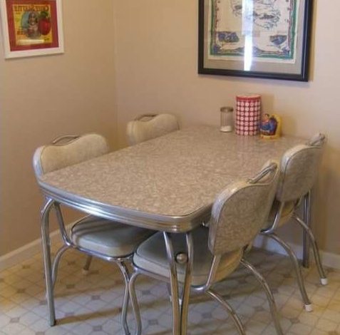 Main Body The image of a 1950s-style kitchen table, complete with chrome legs and a Formica top, evokes a particular era in American home design characterized by optimism and a booming post-war economy. These tables were designed not only for durability but also for ease of cleaning, reflecting the era’s innovation in synthetic materials. Formica, a heat-resistant, wipe-clean laminate, became popular for its ability to mimic more expensive materials like wood or stone, making stylish home decor accessible to the middle class.